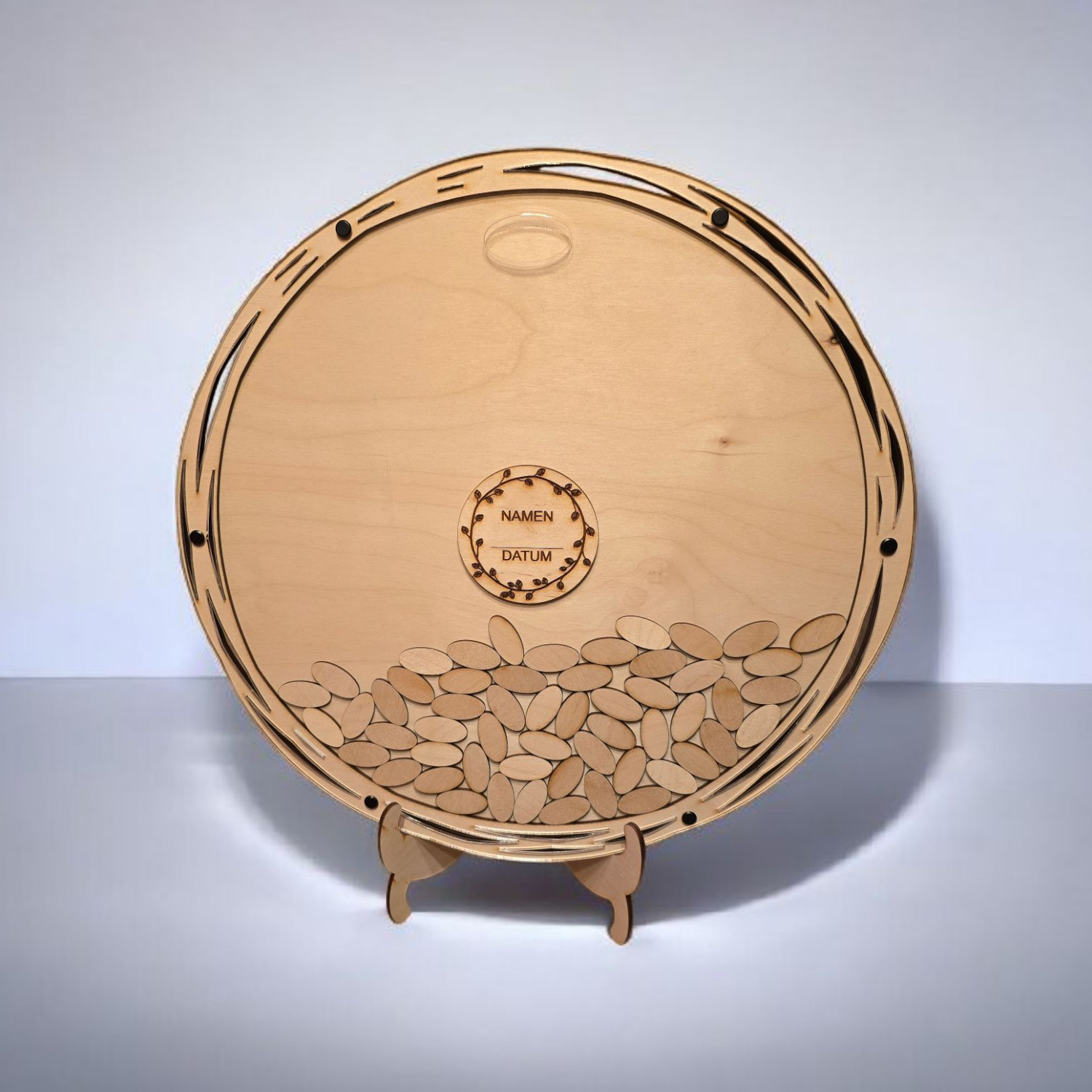 Schaffe bleibende Erinnerungen an deinen besonderen Tag mit diesem runden Holzgästebuch. Es bietet deinen Gästen eine kreative Möglichkeit, ihre Wünsche und Gedanken zu hinterlassen. Das edle Design aus hochwertigem Holz, transparentem Acrylglas und einer individuellen Gravur machen es zu einer einzigartigen Alternative zum klassischen Gästebuch.